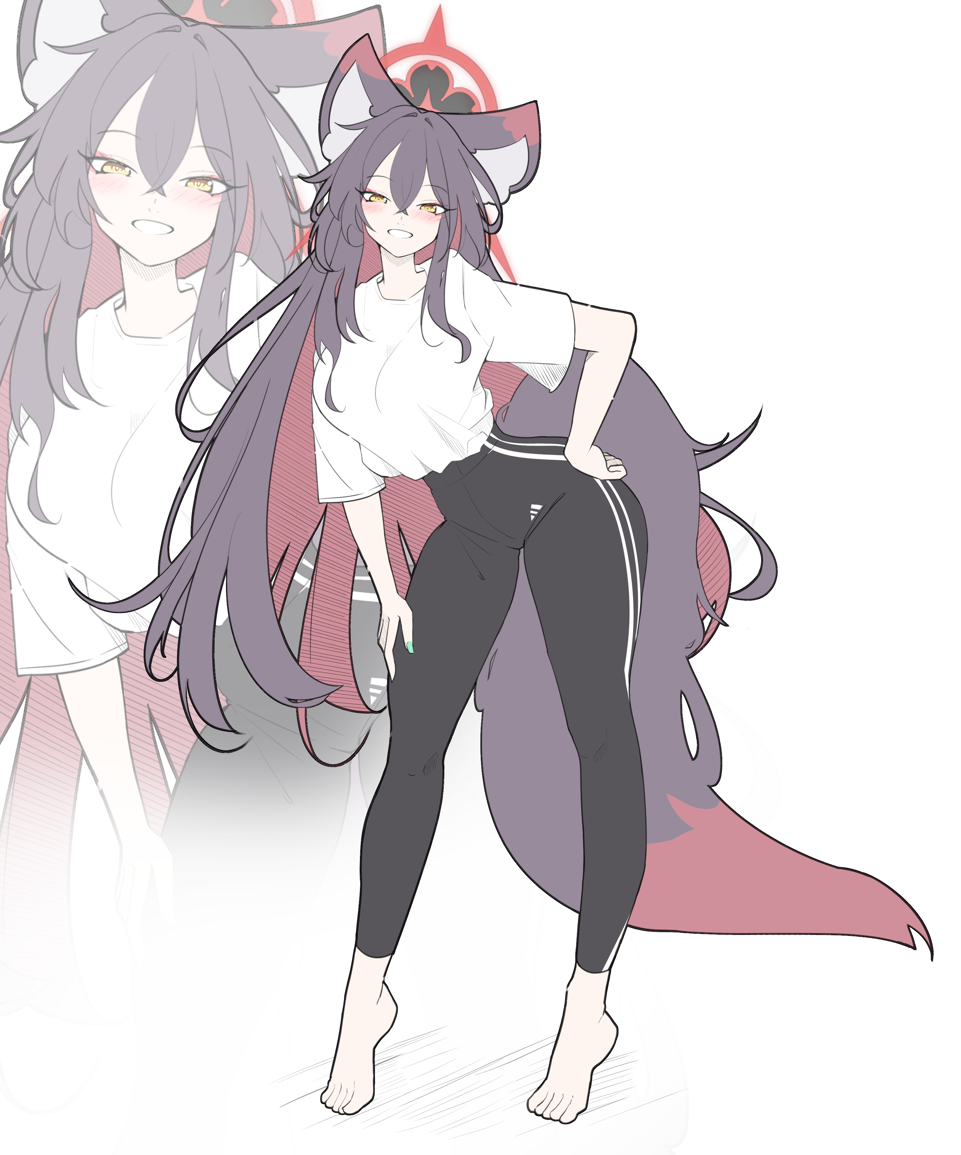 tamahagane, highres, 1girl, arms behind back, bag, blazer, bow, bowtie, bra, breasts, chart, collared shirt, cowboy shot, greyscale, hair between eyes, holding, holding bag, huge breasts, jacket, long hair, long sidelocks, long sleeves, looking at viewer, manbiki jk wa mizukara ori ni hairu, miniskirt, monochrome, multiple views, open mouth, pleated skirt, school uniform, shinozaki sayoko (manbiki jk), shirt, sidelocks, sketch, skirt, smile, standing, straight hair, tachi-e, tareme, tented shirt, underwear, upper body