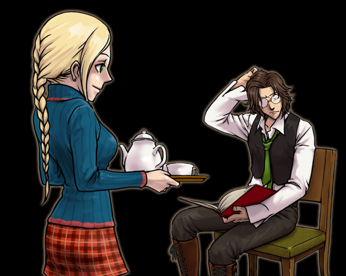 1boy1girlblonde hairbookbraidbrown hairchairglassesgreen eyeslong hairnecktieponytailshort hairskirtsweatertea