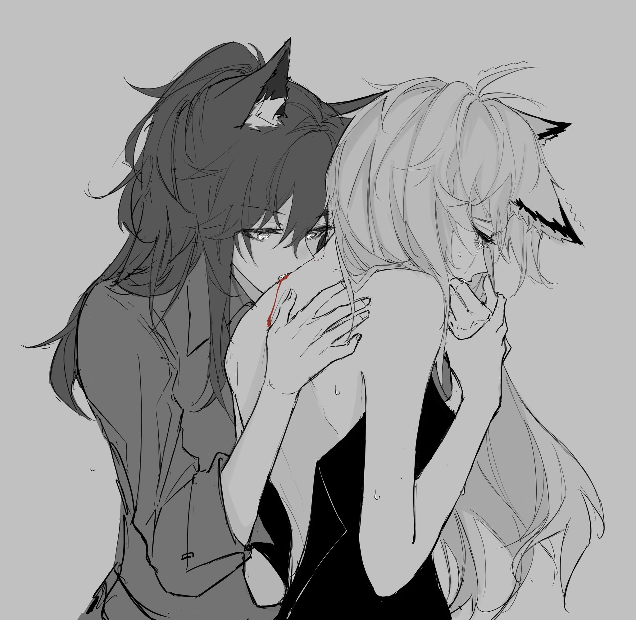 2girlsalternate costumeanimal ear fluffanimal earsbackless dressbackless outfitbare backbare shouldersbite markbitingbloodclosed eyescollared shirtdresshair between eyeslong hairlong sleeveslskkdskkdmessy hairmonochromemultiple girlsponytailscarshirtsimple backgroundspot colorstraplesssweatupper bodywhite backgroundwolf earsyuri