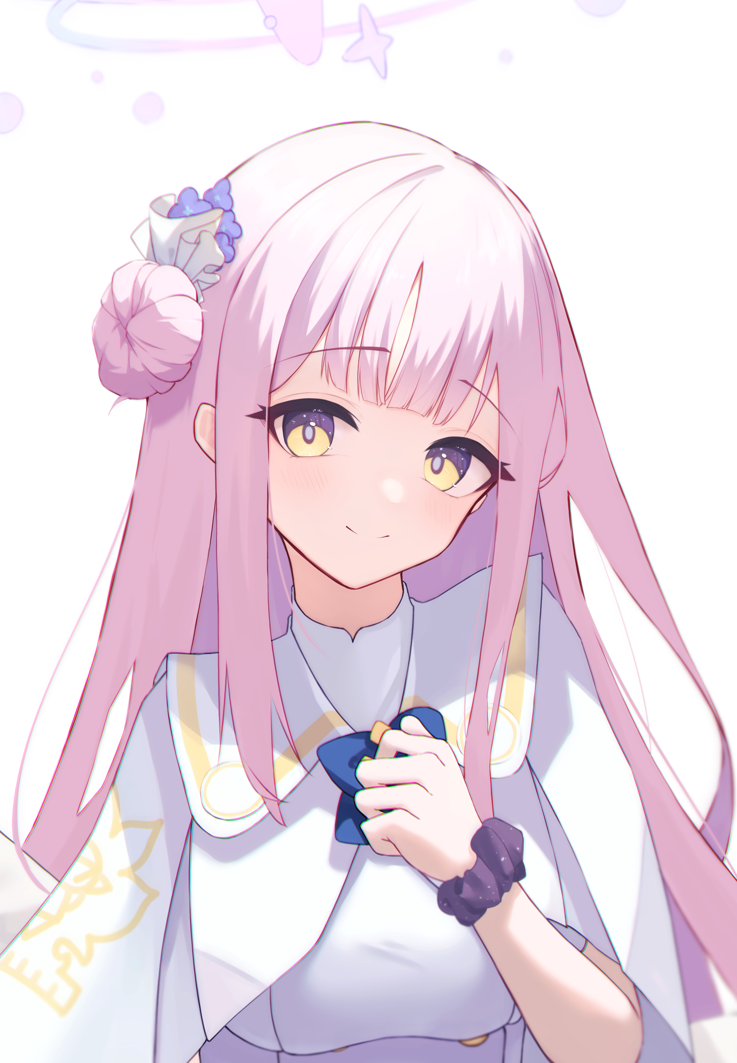 1girlblue bowblushbowbreastscapeletclosed mouthdressflowergold trimhair bunhair flowerhair ornamenthalolong hairmedium breastsmulticolored eyesopen mouthpink halopurple eyesscrunchiesimple backgroundsingle hair bunsingle side bunsmilesoloupper bodyvery long hairwhite backgroundwhite capeletwhite dresswrist scrunchieyellow eyes