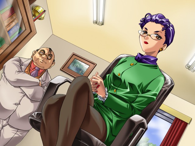 1boy1girlbrown eyeschaircrossed armscrossed legsglassesindoorspantyhosepurple hairred nailsshort hairsitting
