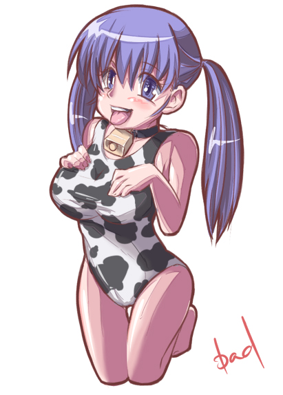 1girlanimal printbellblue eyesblue haircow printcowbellfemale focuskneelinglong hairmatching hair/eyesone-piece swimsuitsoloswimsuittonguetwintails