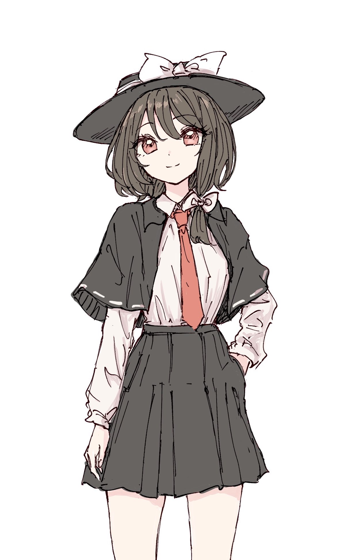 1girlarm at sideasymmetrical hairblack capeletblack hairblack hatblack skirtbowcapeletcollared shirtcowboy shothair bowhand in pockethathat bowhat ribbonlong sleeveslooking at viewermedium hairnecktiered eyesred necktieribbonribbon trimribbon-trimmed capeletshirtsimple backgroundskirtsmilesolostandingwhite backgroundwhite bowwhite shirt