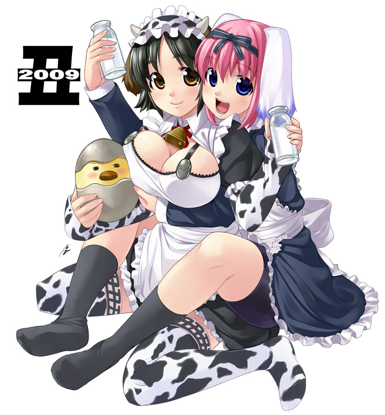 00s20092girlsanimal earsanimal printbellblack hairblue eyesbottlebreastsbrown eyescleavagecow girlcow printcowbellfeethornslarge breastsmaidmilkmultiple girlsnew yearpink hairsittingsocksthighhighs