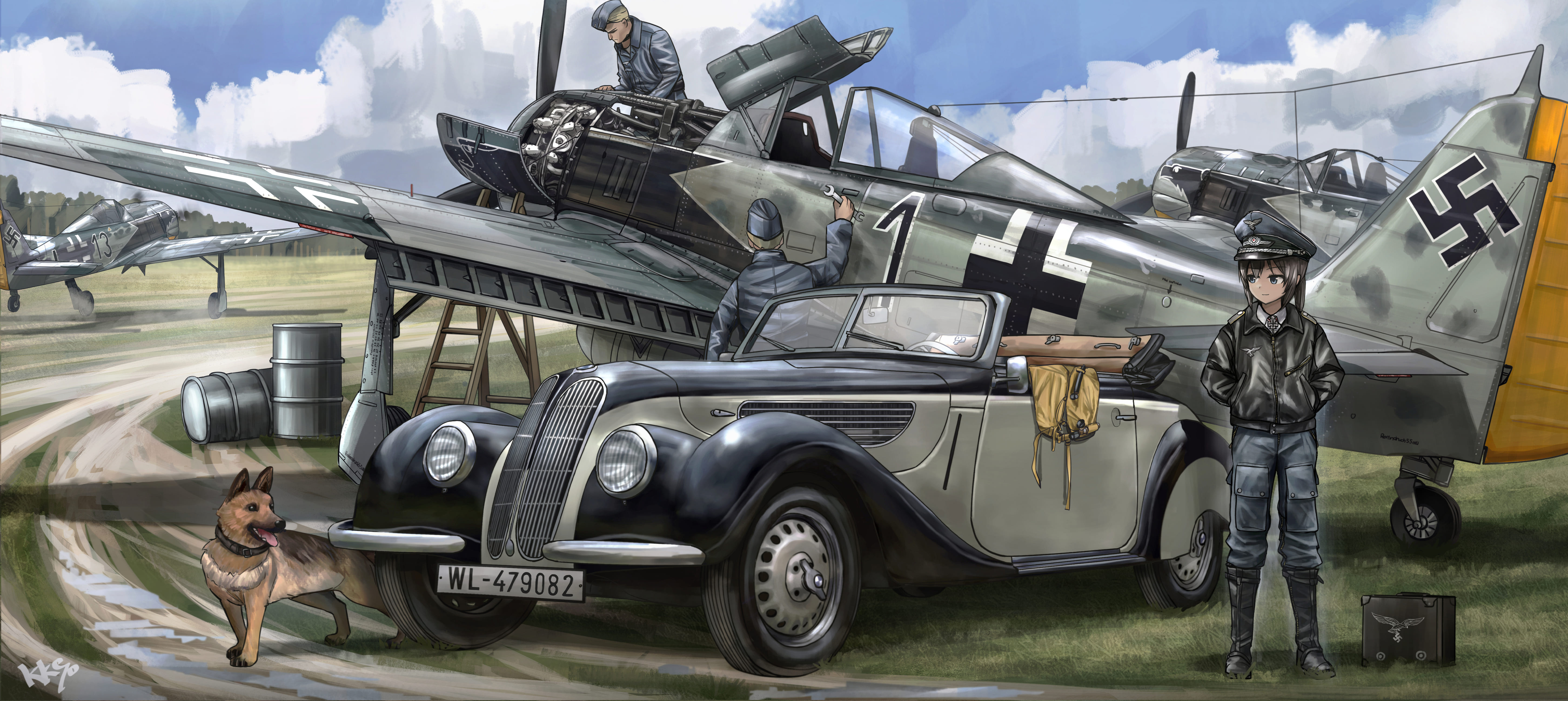 1girl2girlsaircraftairplanebalkenkreuzblack bootsblack jacketblue hatblue jumpsuitblue pantsblue skybootscarcloudcollared shirtcrossdogdrum (container)german shepherdhatiron crossjacketjumpsuitleatherleather jacketlong sleevesluftwaffemechanicmedalmilitarymilitary uniformmilitary vehiclemotor vehiclemultiple girlspantspeaked cappropeller fightershirtskyswastikavehicle focuswhite shirtworld war ii