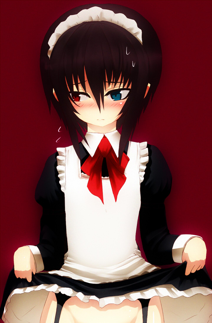 1girlandrogynousblushbowclothes liftfemale focusgarter strapsheterochromiamaidskirtskirt liftsolo