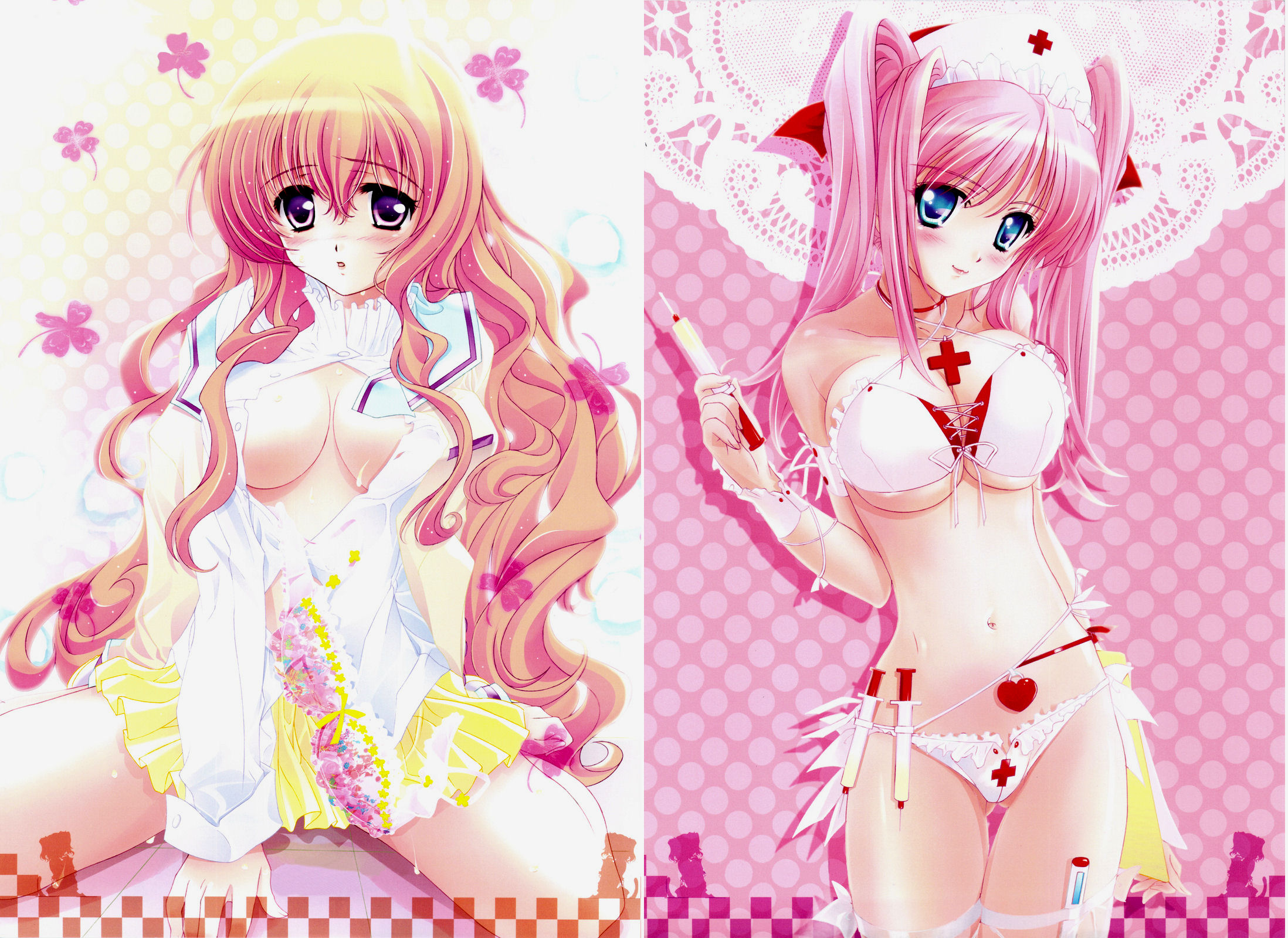 2girlsblue eyesblushbralingerielong hairmultiple girlsnurseopen clothesopen shirtpantiespink hairpurple eyesshirttwintailsunderwearunderwear only