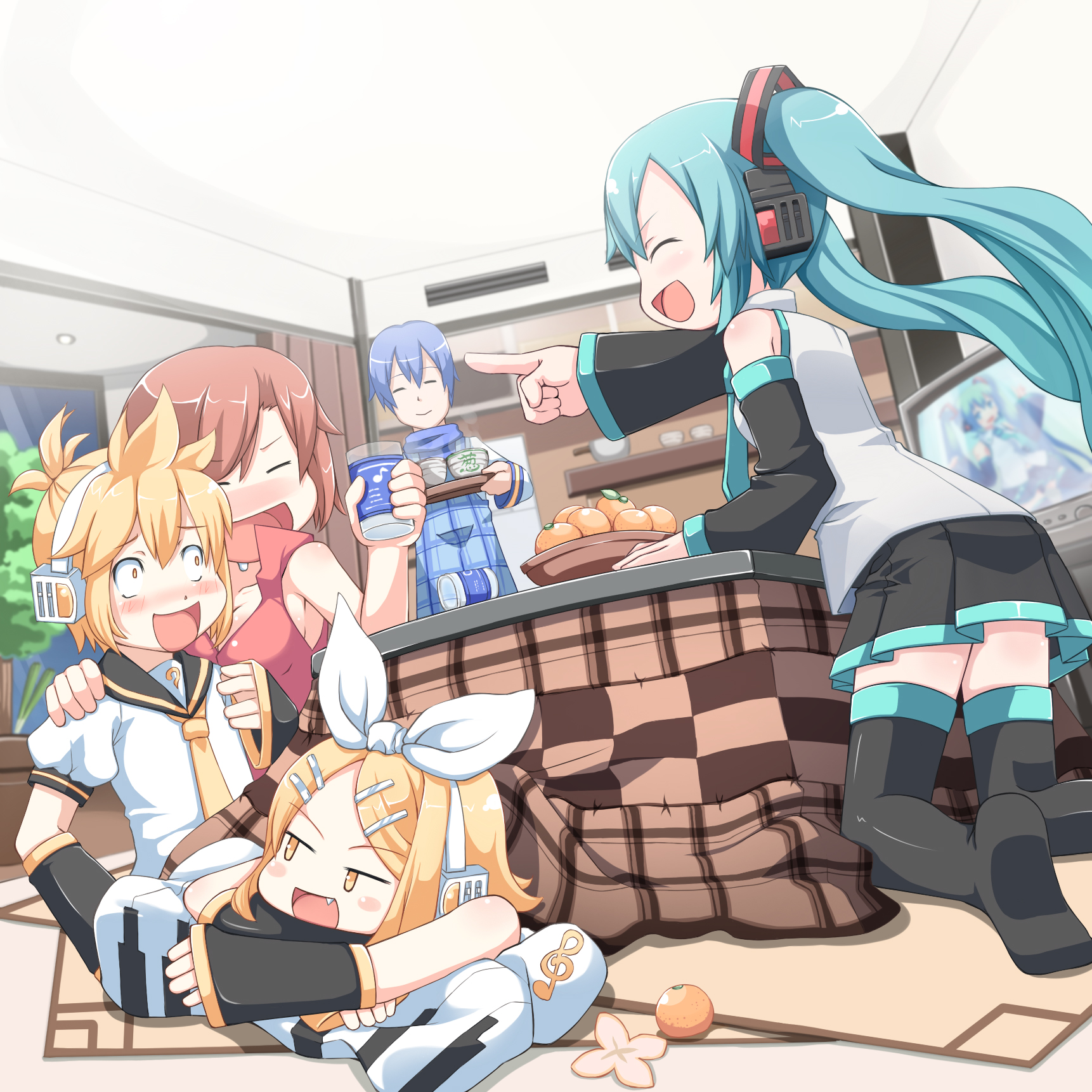 waka (wk4444), 25-ji miku, hatsune miku, project sekai, vocaloid, commentary request, highres, 5girls, :o, ;), ahoge, animal ears, black shirt, black sweater, blue eyes, blue hair, blue necktie, blunt bangs, blush, bow, bowtie, cat ears, closed mouth, collared shirt, crop top, cropped shirt, cropped torso, dress, glasses, green eyes, green hair, grey hair, heterochromia, long hair, long sleeves, looking at viewer, midriff, multiple girls, multiple persona, navel, necktie, one eye closed, open mouth, red bow, red bowtie, red dress, red eyes, red necktie, shirt, short hair, short sleeves, simple background, smile, sweater, twintails, white background, white shirt, wing collar