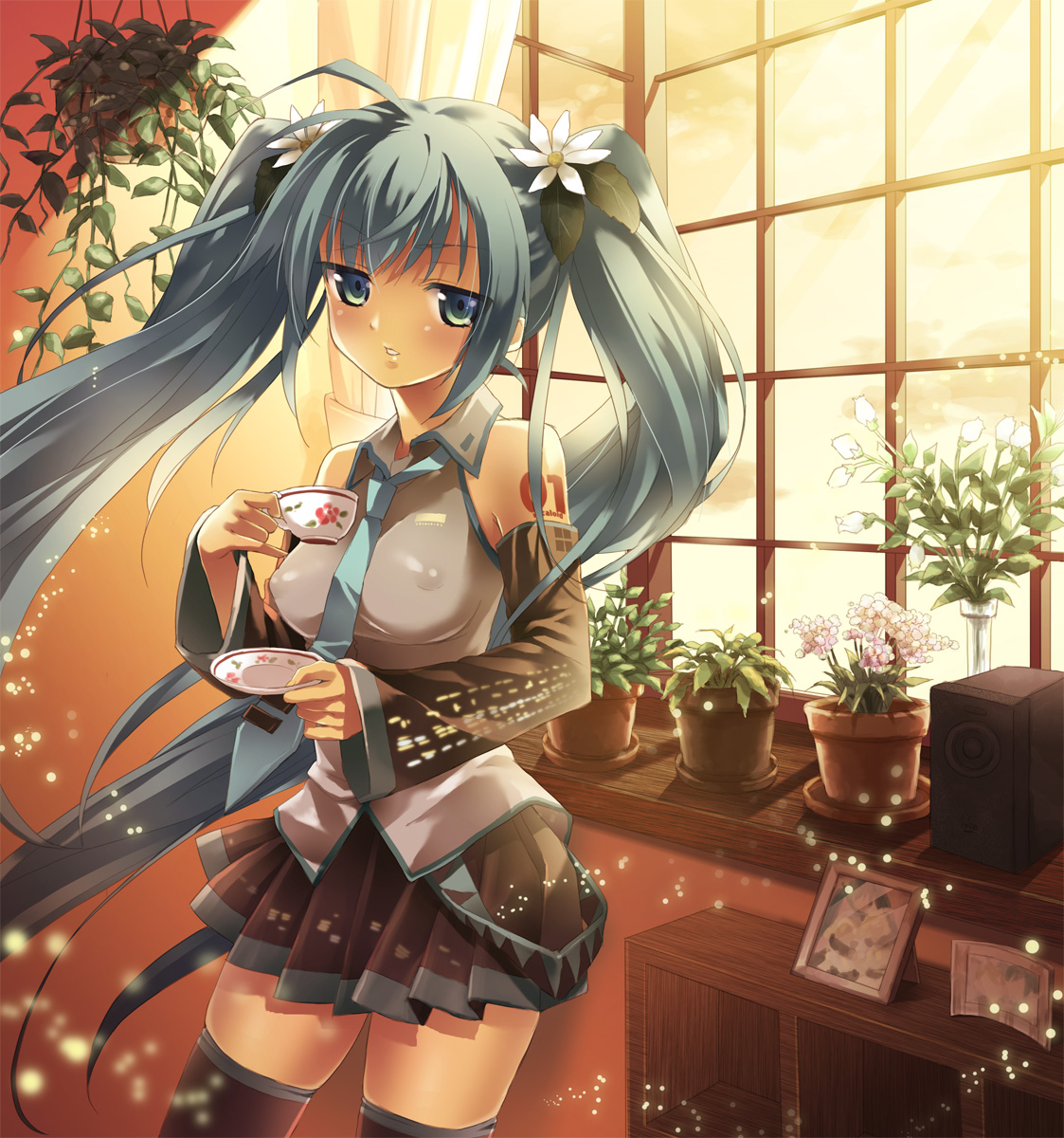 :o1girlblue eyesblue hairblushbreastscovered erect nipplescupdetached sleevesfemale focusflowerlarge breastslong hairmatching hair/eyesmedium breastsnecktienipplesskindentationskirtsoloteathighhighstwintailszettai ryouiki