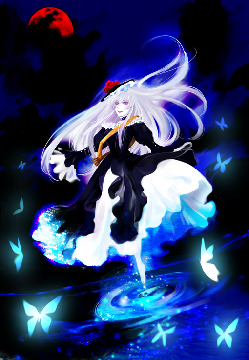 abe takakazu, yowane haku, vocaloid, silver hair, lowres, 1girl, alcohol, blush, bottle, bow, breasts, cameo, cleavage, detached sleeves, female focus, headphones, large breasts, long hair, midriff, necktie, red eyes, solo, very long hair, yaranaika