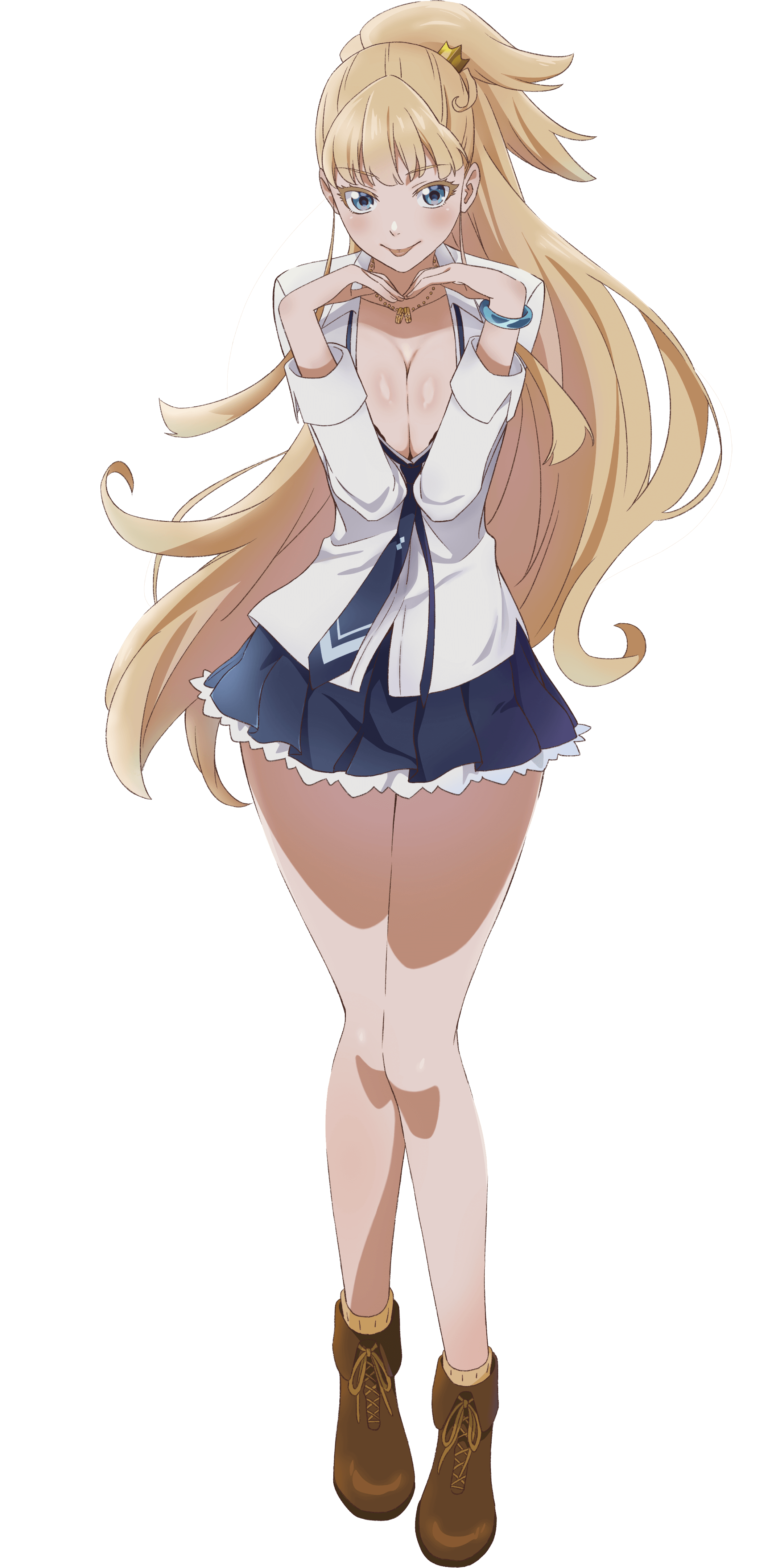 1girlblonde hairblue eyesblue necktieblue skinblunt bangsbootsbreastsbrown bootsbrown shoescleavageclosed mouthcollarbonecollared shirtcolored skinfemale focusfrilled skirtfrillsfull bodyhuge breastslace-up bootslarge breastslayered skirtlegslong hairlong sleeveslooking at viewerminiskirtnecktiepleated skirtponytailschool uniformsexually suggestiveshirtshoesskirtsmilesockssolosolo focusteeththighstonguetongue outtsurimewhite shirtwhite socks