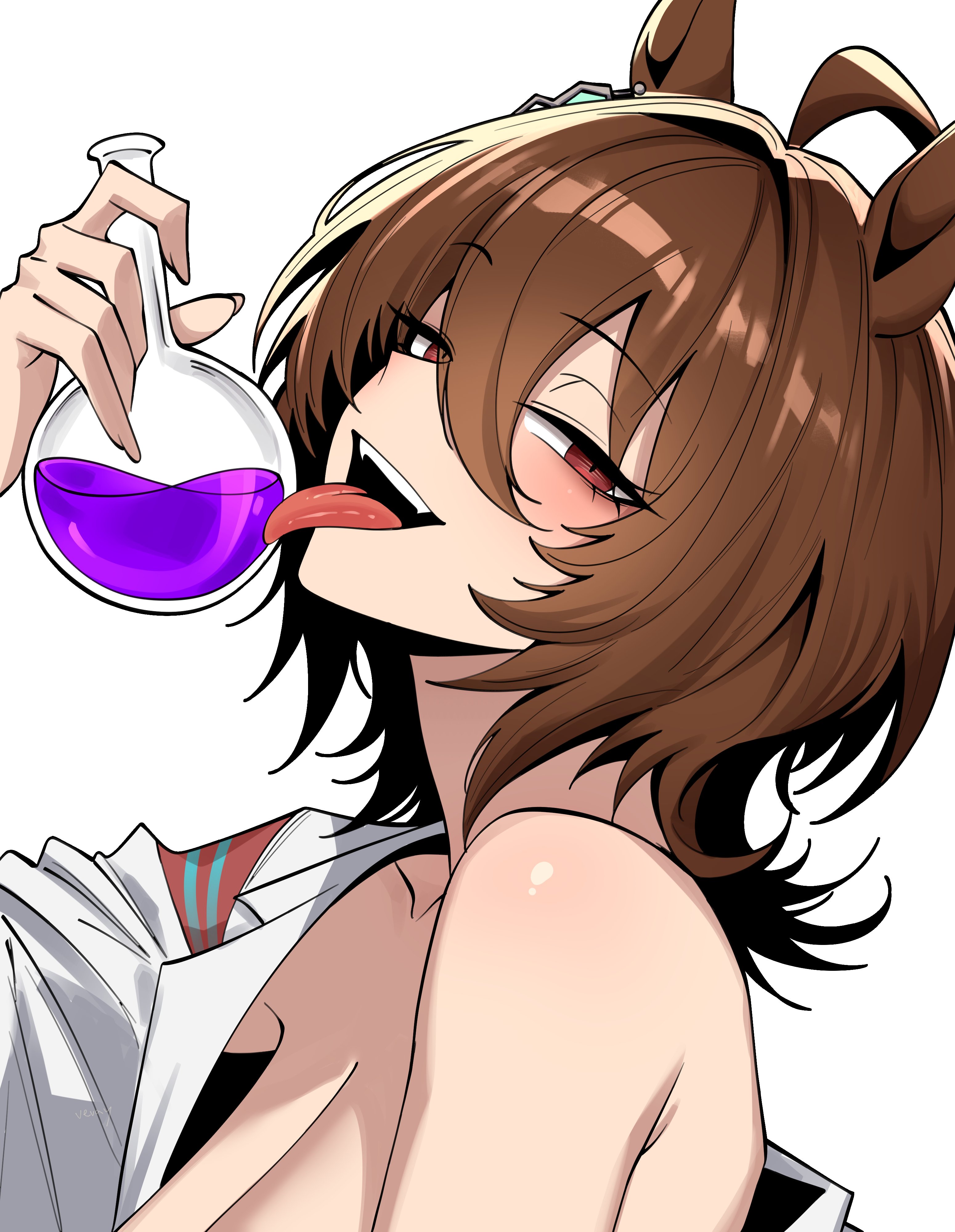 1girlanimal earsbeakerholdingholding beakerhorse earshorse girlsimple backgroundsolotonguetongue outupper bodywhite background