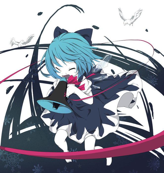 1girlbirdblue hairclosed eyesdovefemale focusmegaphonepale skinparodyribbonsadshort hairsolotearswings