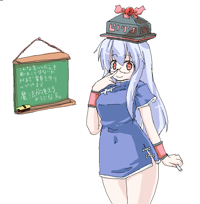1girladjusting eyewearbespectacledchalkchalkboardchina dresschinese clothesdressfemale focusglasseshatlong hairoekakired eyessimple backgroundsoloteacherwhite background