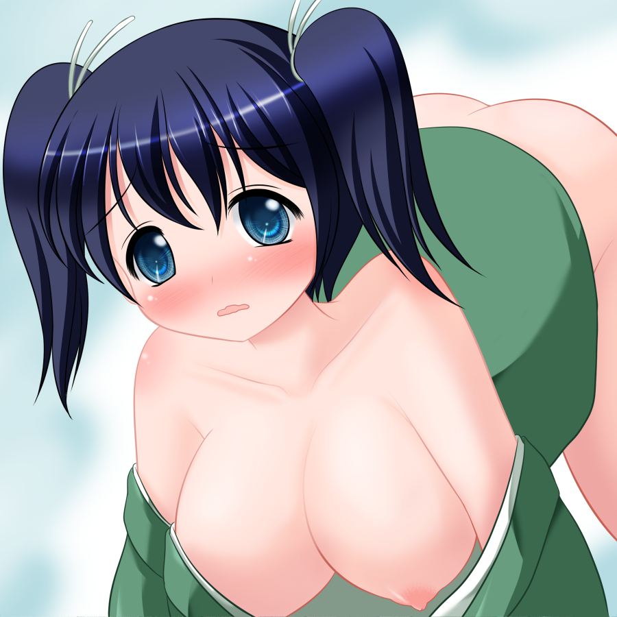 blue eyesblue hairblushbottomlessbreastsfemaleFlag for Deletionhair ribbonlarge breastslooking at vieweroff shoulderopen mouthpersonificationribbonsolotied hairtwintails