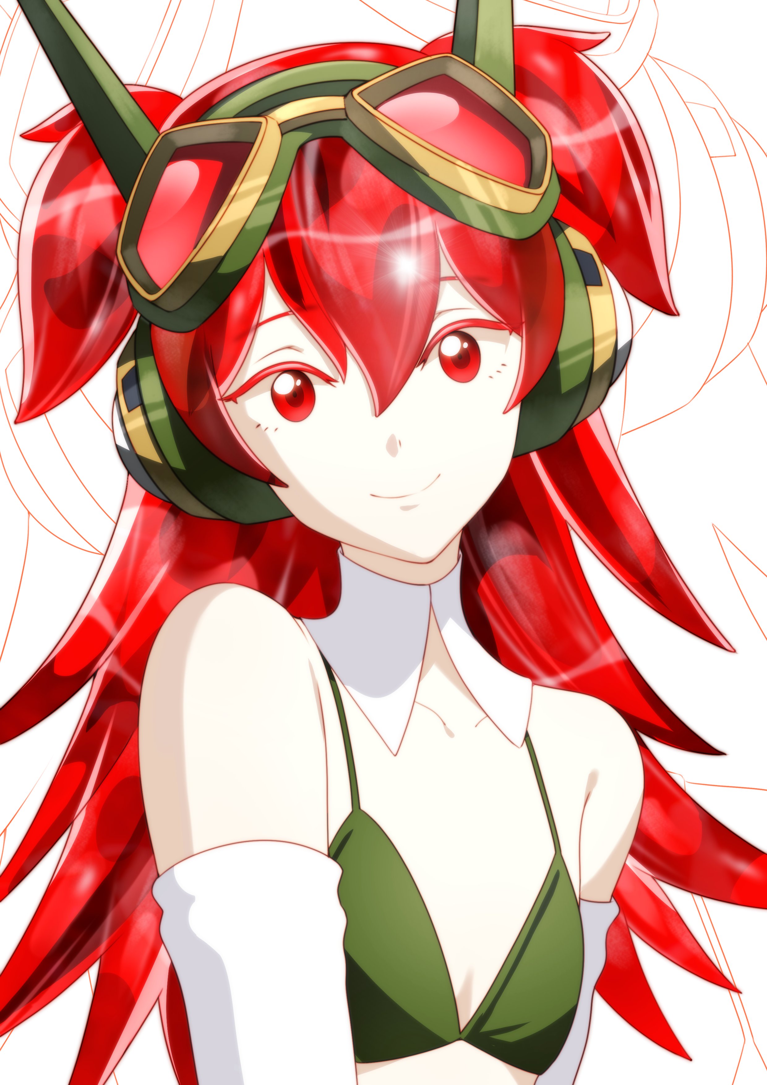 1girlbikinibikini top onlycollarcrystal hairdetached collardetached sleevesflat chestgogglesgoggles on headgreen bikinihair between eyeshead tiltheadphoneslong hairlooking at viewerparodyred eyesred hairsmilesolostyle parodyswimsuittruck (nifast (greentail))two side upupper bodywhite backgroundwhite collarwhite sleeves
