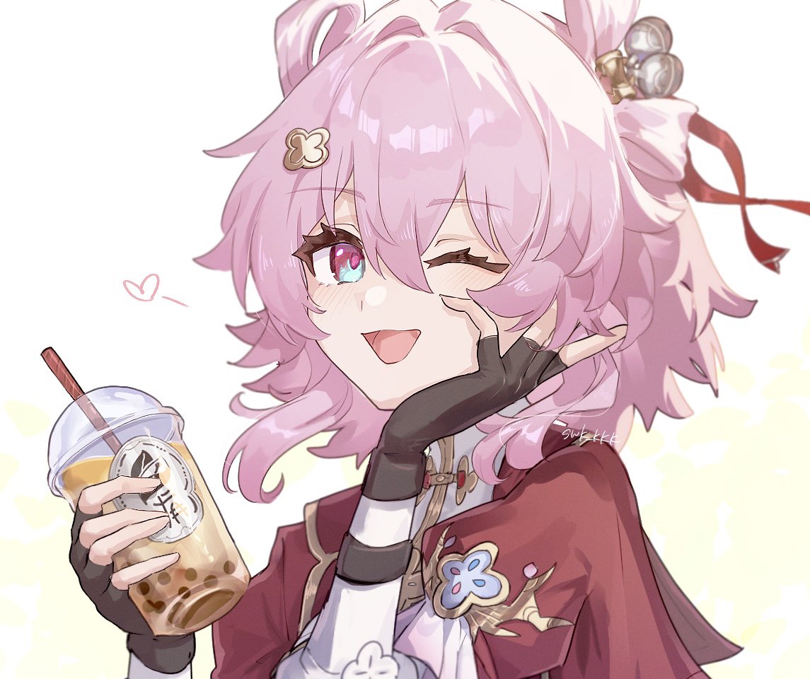 sakutein oekaki, ling (arknights), arknights, commentary, highres, 1girl, ;q, alternate costume, animal ear hairband, animal ears, black hairband, black leotard, black shrug, blue hair, blush, bow, bowtie, breasts, brown pantyhose, cleavage, closed mouth, cowboy shot, cup, diamond-shaped pupils, diamond (shape), dragon girl, dragon horns, drink, earrings, fake animal ears, gourd, groin, hair between eyes, hairband, holding, holding drink, holding gourd, horns, jewelry, large breasts, leotard, long hair, long sleeves, looking at viewer, multicolored hair, one eye closed, pantyhose, playboy bunny, pointy ears, purple eyes, purple hair, rabbit ear hairband, rabbit ears, sakazuki, shrug (clothing), simple background, smile, solo, standing, strapless, strapless leotard, streaked hair, symbol-shaped pupils, tongue, tongue out, traditional bowtie, twitter username, very long hair, white background, yellow bow, yellow bowtie