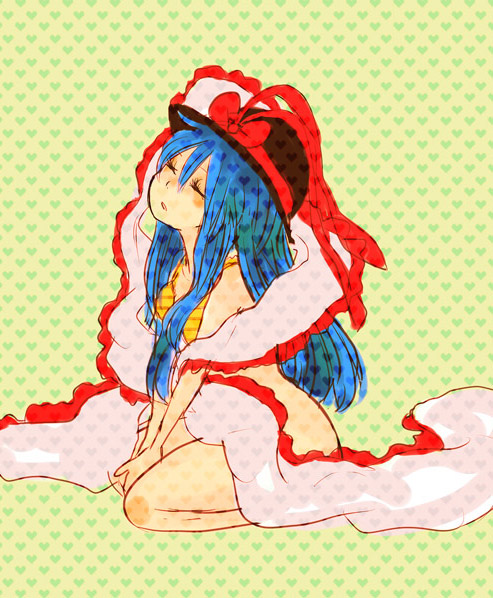 1girlblue hairbottomlessbraclosed eyescosplayfemale focushatlingerielong hairnagae iku (cosplay)scarfsolounderwear