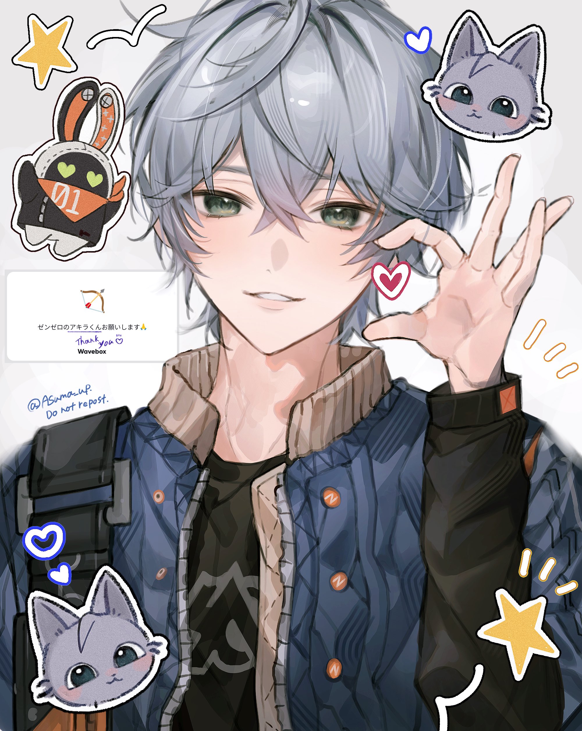 1boybagblack shirtblue jacketbow (weapon)catgreen eyesgrey backgroundgrey catgrey hairhair between eyeshalf-heart handsheartheart handsheart in heart handsheart stickerjacketlooking at viewermale focusshirtshort hairshoulder bagsmilesolostar (symbol)star stickerstickerteethtwitter usernameunzippedupper bodyweapon