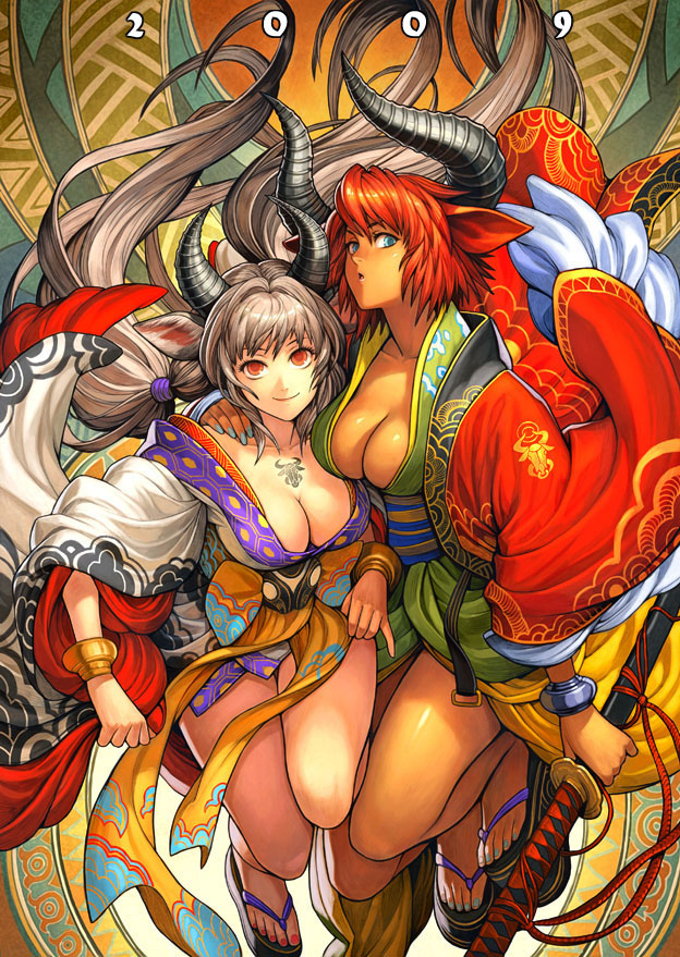 2girlsanimal earsblue nailsbreastscleavagedark skindark-skinned femalehornsjapanese clotheskatanakimonolong hairmultiple girlsnail polishorange eyesred hairshort hairsmileswordtattooweapon