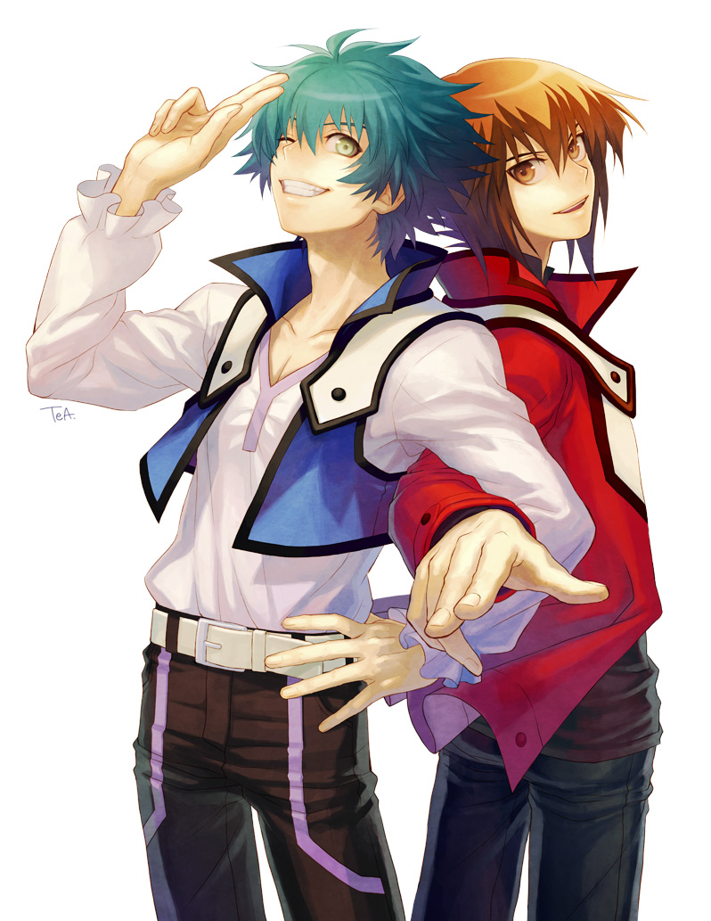 2boysbrown eyesbrown hairduel academy uniform (yu-gi-oh! gx)green eyesgreen hairmale focusmultiple boysobelisk blue uniformosiris red uniformschool uniformshort hairsmile