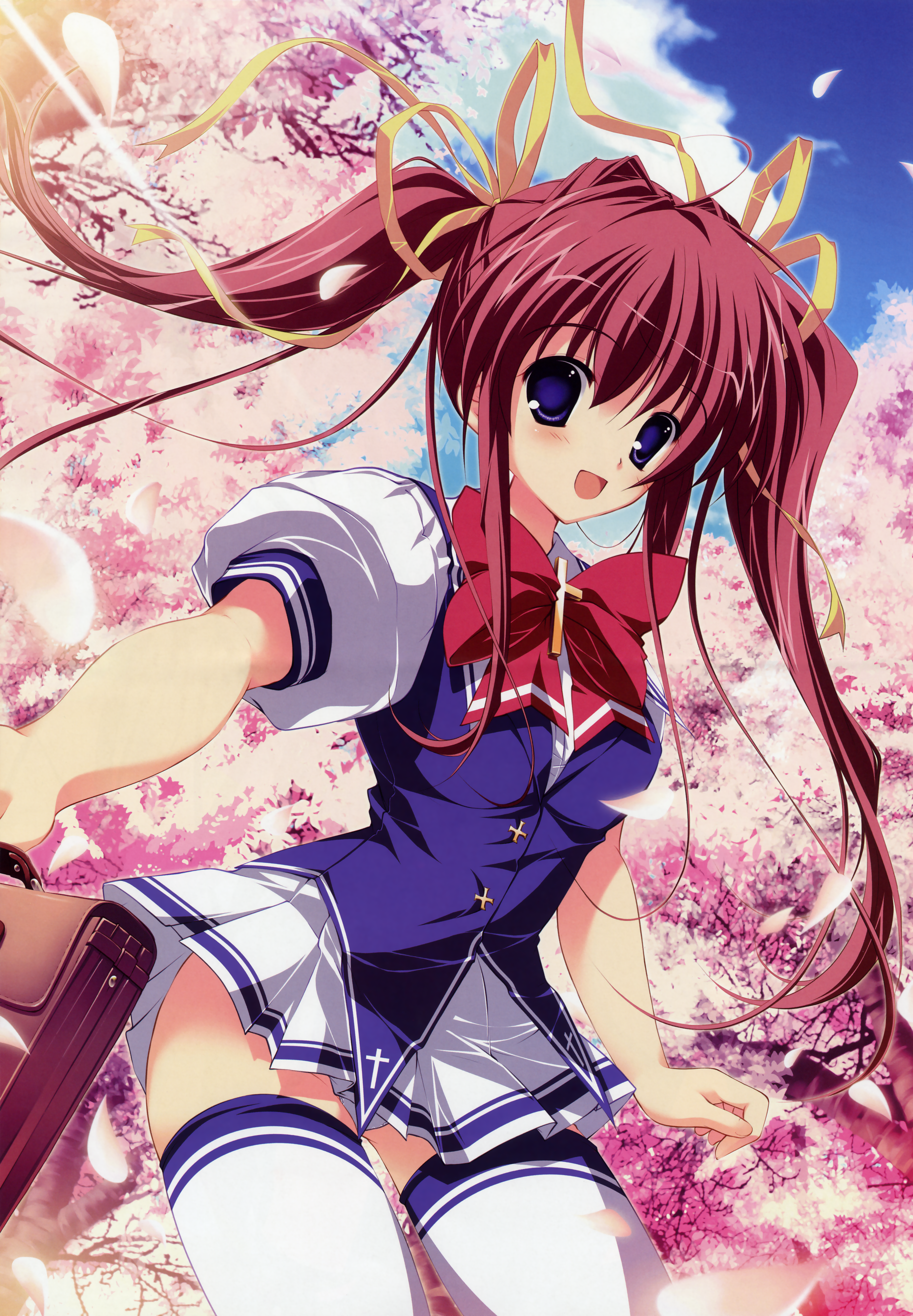 1girlblue eyesfemale focushair ribbonlong hairpetalsred hairribbonschool uniformsolothighhighstwintailswhite thighhighszettai ryouiki