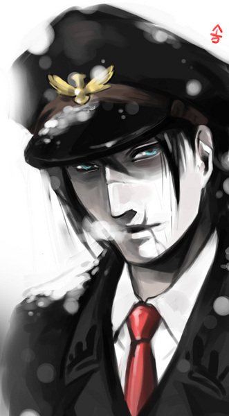 black hairblue eyeshatmale focusmilitarynecktiepeaked capscarscar on facescar on mouthsnowsolo