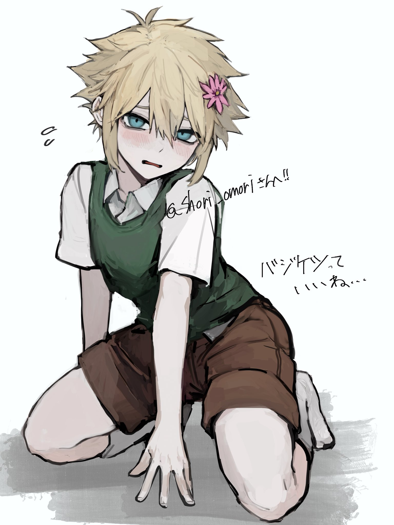 1boyantenna hairarm supportblonde hairblue eyesblushbrown shortscollared shirtdouble-parted bangsflowerflying sweatdropsfull bodygreen sweater vesthair between eyeshair flowerhair ornamentlooking at viewermale focusparted lipsshirtshort hairshortssidelockssimple backgroundsolosweater vestwhite backgroundwhite shirt