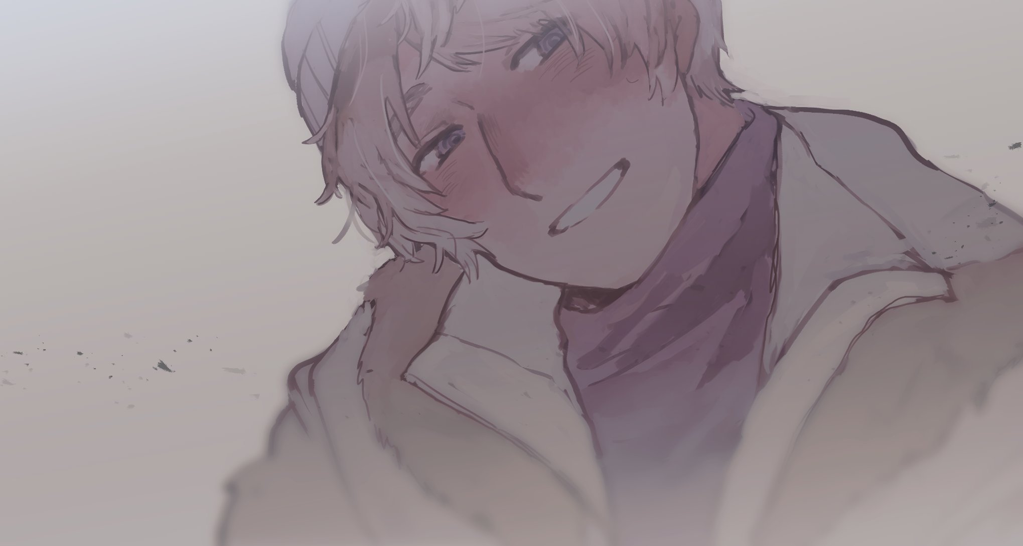 1boydown jacketfur trimfur-trimmed jacketgrey backgroundgrey hairhatho gya1218jacketlapelslooking at viewermale focusofficial alternate costumeopen clothesopen jacketpurple eyespurple scarfscarfshort hairsimple backgroundsmilesoloteethupper bodywhite hatwhite jacket