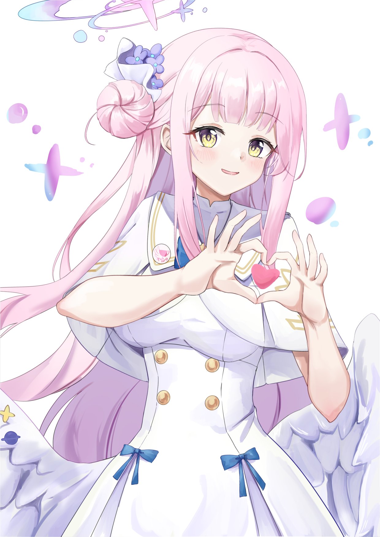 1girlangel wingsblue bowblushbowbreastscapeletdressfeathered wingsflowergold trimhair bunhair flowerhair ornamenthaloheartheart handslong hairlooking at viewerlow wingsmedium breastsopen mouthpink halosimple backgroundsingle hair bunsingle side bunsmilesolounderbustvery long hairwhite backgroundwhite capeletwhite dresswhite wingswing ornamentwingsyellow eyes