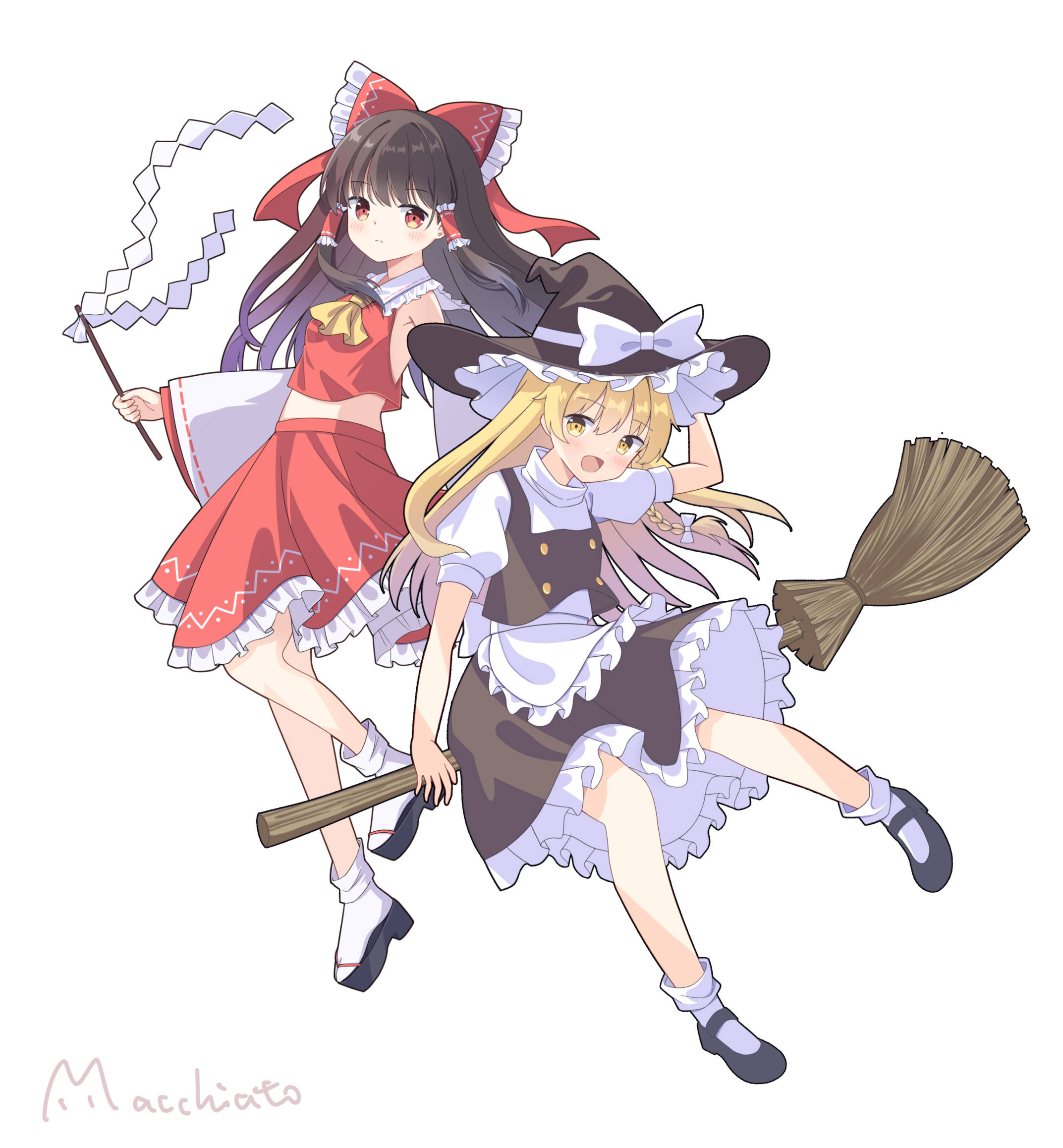 2girlsapronartist nameascotblack hatblack shoesblack skirtblack vestblonde hairblushbowbraidbreastsbroombroom ridingbrown hairdetached sleevesfrilled bowfrilled hair tubesfrilled skirtfrillsfull bodygoheihair bowhair tubeshathat bowholdingholding goheilong hairlooking at viewermary janesmidriffmultiple girlsopen mouthplatform sandalspuffy short sleevespuffy sleevesred bowred eyesred skirtribbon trimribbon-trimmed sleevessandalsshoesshort sleevessimple backgroundskirtskirt setsmall breastssmilesocksvery long hairvestwaist apronwhite backgroundwhite bowwhite sockswitch hatyellow ascot