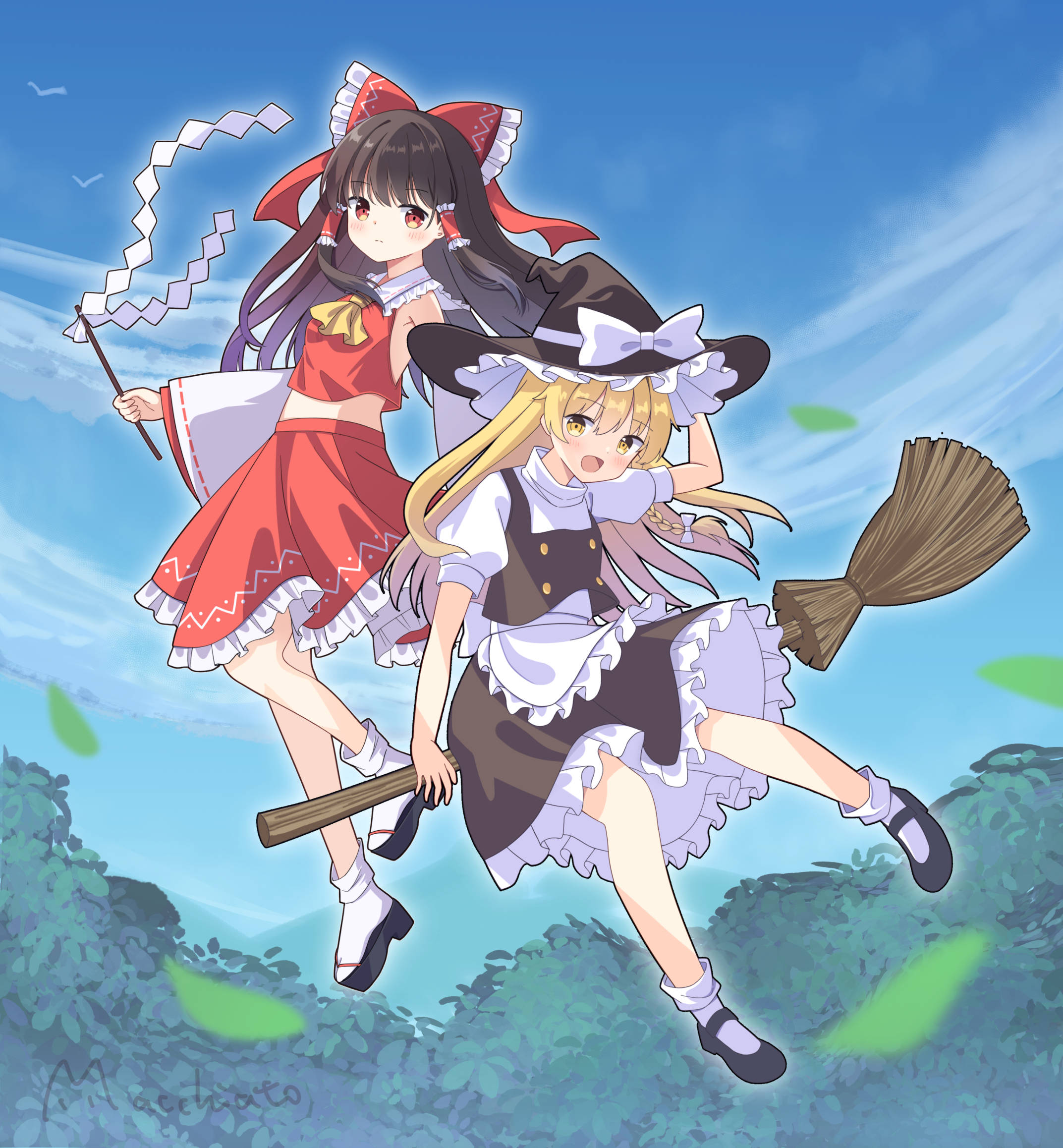 2girlsapronartist nameascotblack hatblack shoesblack skirtblack vestblonde hairblushbowbraidbreastsbroombroom ridingbrown hairdetached sleevesfrilled bowfrilled hair tubesfrilled skirtfrillsfull bodygoheihair bowhair tubeshathat bowholdingholding goheilong hairlooking at viewermary janesmidriffmultiple girlsopen mouthplatform sandalspuffy short sleevespuffy sleevesred bowred eyesred skirtribbon trimribbon-trimmed sleevessandalsshoesshort sleevesskirtskirt setskysmall breastssmilesocksvery long hairvestwaist apronwhite bowwhite sockswitch hatyellow ascot