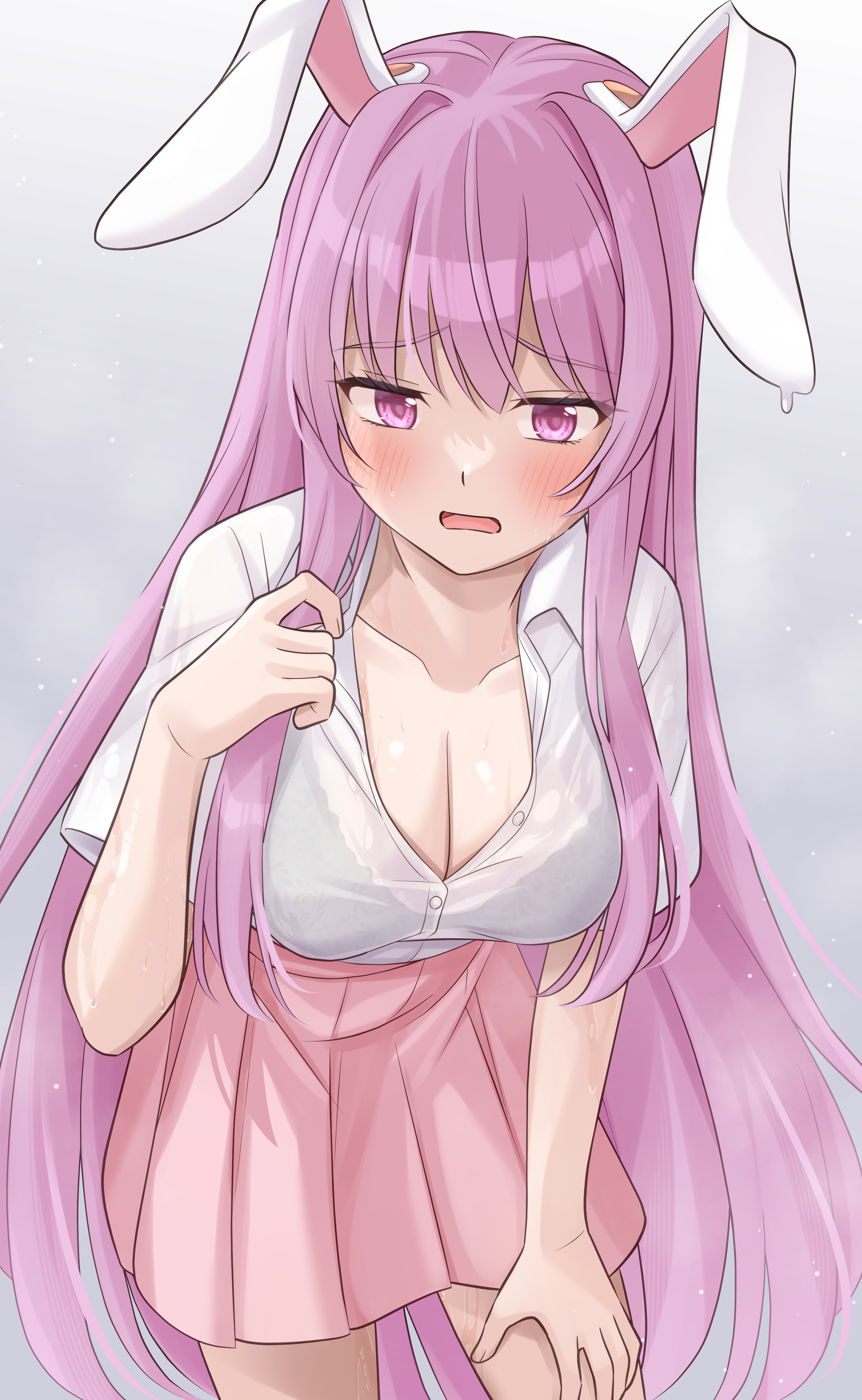 1girlanimal earsblack brablushbrabra visible through clothesbreastscleavagecowboy shotgrey backgroundhand on own kneelarge breastslong hairlooking at vieweropen mouthpink skirtpleated skirtpurple eyespurple hairrabbit earsrabbit girlshirtshort sleevessidelockssimple backgroundskirtsolounderwearvery long hairwhite shirt