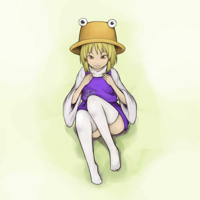 1girlblousebrown hatfeetfemale focusfull bodygradient backgroundgreen backgroundhatshirtsimple backgroundskirtsolothighhighswhite shirtwhite thighhighs