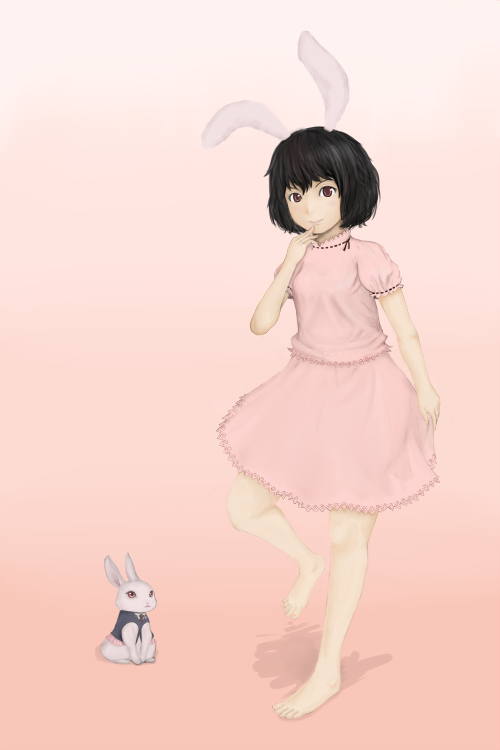 1girlbarefootfeetfemale focusfull bodygradient backgroundpink backgroundrabbitrabbit earssimple backgroundsolostanding