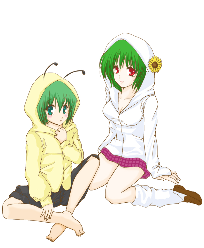 2girlsadapted costumeantennaebarefootbreastscleavagefemale focusflowergreen eyesgreen hairhoodhooded jackethoodieindian stylejacketkneehighslarge breastsloafersmultiple girlsparkaplaid clothesplaid skirtred eyesshoesshort hairsimple backgroundsittingskirtsockssunflowerwarizawhite background