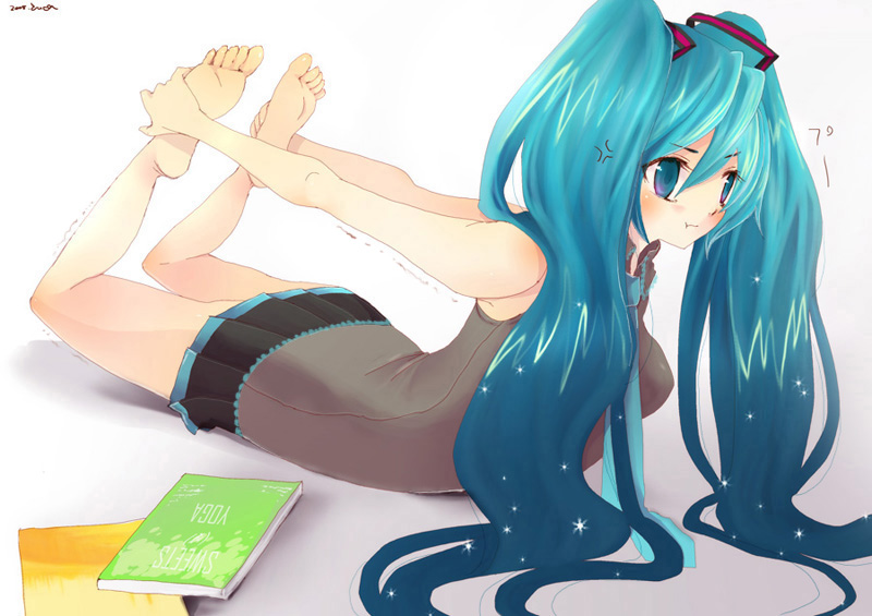 :t1girlarched backbarefootblue eyesblue hairbookfeetfemale focushands on feetholding own footlong hairmatching hair/eyesplantar flexionskirtsolostretchingtremblingtwintailsyoga