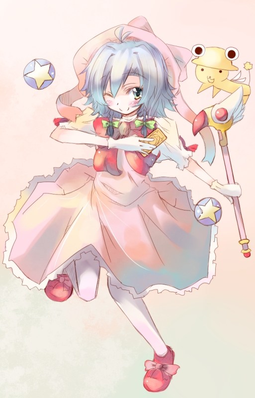 1girlblue eyescosplayfemale focusfuuin no tsuehatkinomoto sakura (cosplay)magical girlmoriya suwako (cosplay)one eye closedparodypink hatribbonrodshort hairstar (symbol)wink