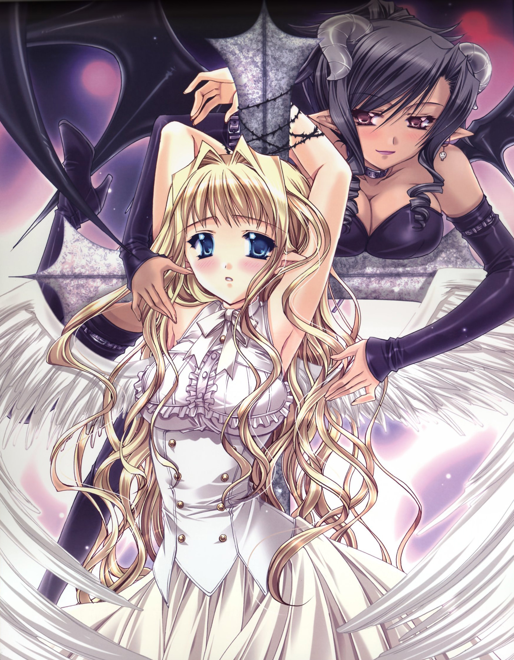 2girlsangelangel and devilarmpitsbarbed wirebdsmblack hairblonde hairblue eyesblushbondageboundbreastsbrown eyescleavagecrossdemondemon girldrill hairelbow glovesgloveshornslarge breastslong hairmultiple girlspointy earswingsyuri