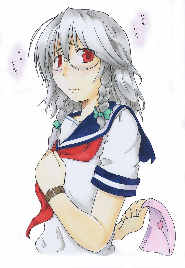 1girlalternate costumebespectacledblushbraidfemale focusglassesletterlove letterred eyesschool uniformsolotwin braidswatchwristwatch