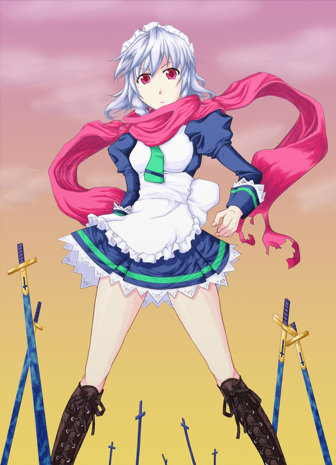1girlbootsbraidfemale focusknee bootsmaidscarfshort hairsoloswordtwin braidsunlimited blade works (reality marble)weapon