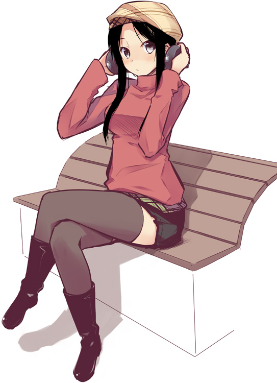 1girlbenchberetblack hairbootscrossed legsfemale focushatheadphonessittingsolosweaterthighhighsturtleneckzettai ryouiki