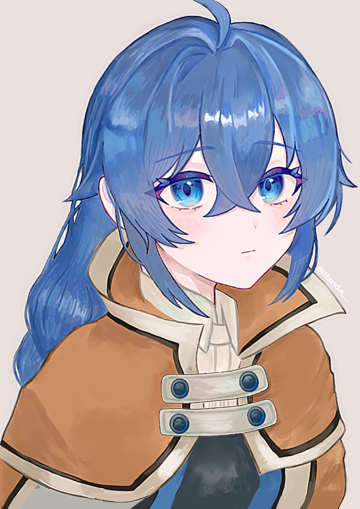 1girlahogeblue eyesblue hairbraidbrown capeletcapeletharulalooking at viewersolosolo focuswhite background