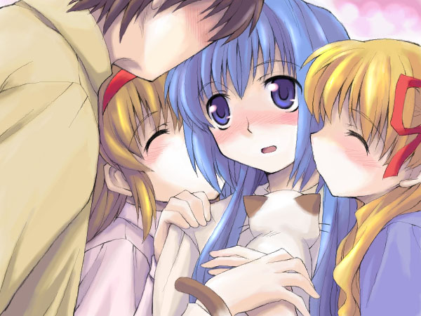 maebara keiichi, sonozaki mion, higurashi no naku koro ni, hands on shoulders, lowres, 00s, 1boy, 1girl, blush, chalkboard, classroom, couple, eye contact, face-to-face, green eyes, green hair, hetero, imminent kiss, indoors, long hair, looking at another, necktie, oekaki, ponytail, red necktie, school, school uniform, shirt, short sleeves, sweat, vest