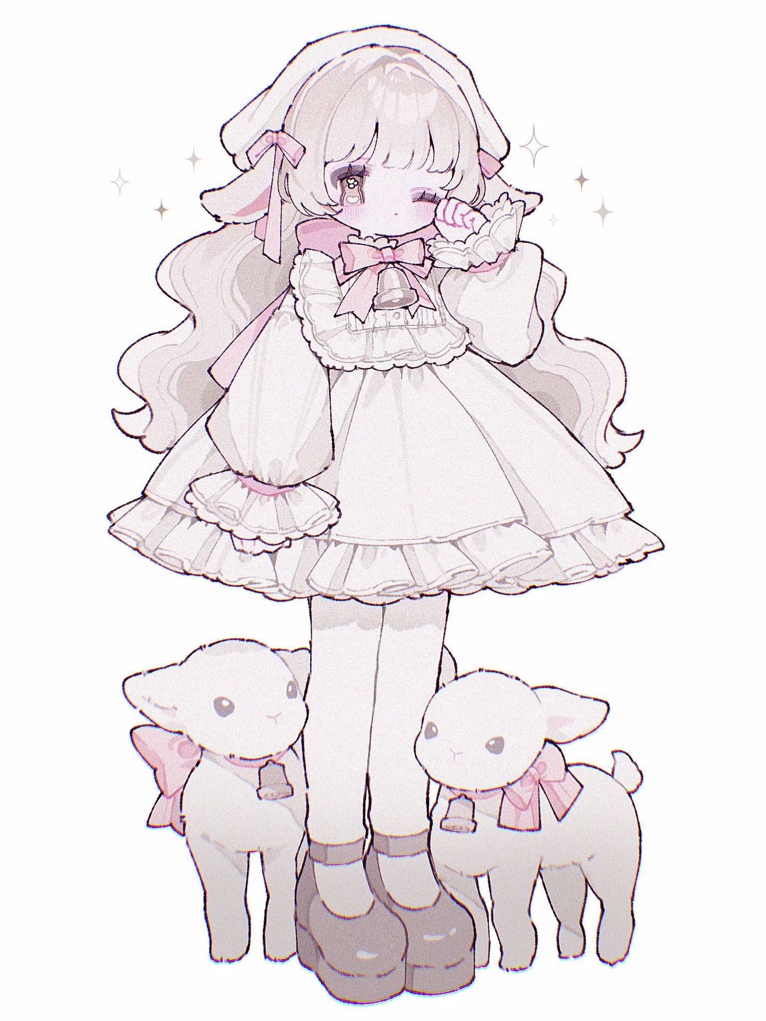 1girlanimal earsbellblushbowbowtiebrown eyesbrown shoesclosed mouthdressfrilled dressfrilled sleevesfrillsfull bodygoatgoat earsgoat girlgrey hairhand uphatlong hairlong sleevesneck bellone eye closedpantyhosered bowred bowtieshoessimple backgroundsolostandingwhite backgroundwhite dresswhite hatwhite pantyhose