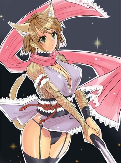 1girlanimal earsbreastscleavagefemale focusgarter beltlarge breastsninjascarfsoloswordthighhighsweapon