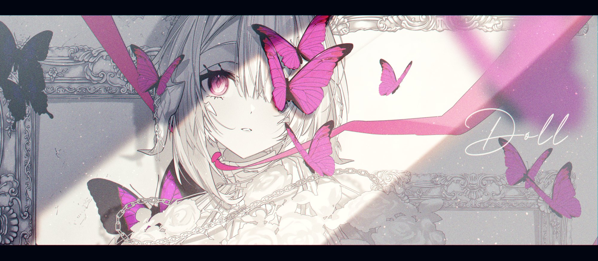 jougasaki noa, mahou shoujo no majo saiban, artist request, chinese commentary, commentary request, commission, highres, second-party source, 1girl, :d, beret, blunt bangs, bow, hair bow, hat, heterochromia, holding, holding paintbrush, long hair, long sleeves, looking at viewer, magical girl, multi-tied hair, multicolored hair, open mouth, paintbrush, pink eyes, polka dot, polka dot bow, sample watermark, smile, solo, sparkle, streaked hair, upper body, watermark, white hair, yellow eyes