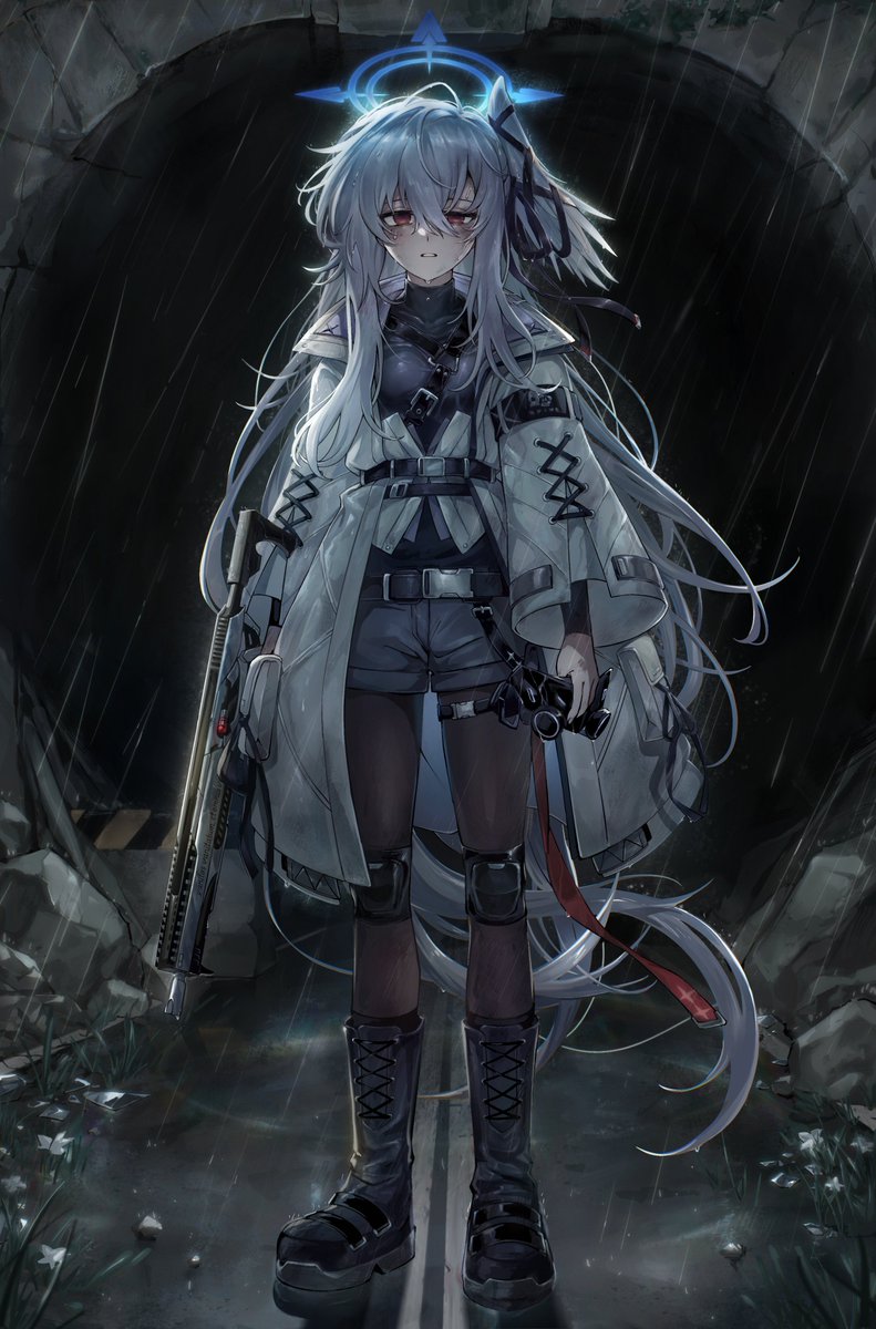1girlalternate costumeazalea (flower)beltbelt around waistblue halobootsboulderempty eyesflowerfull bodygunhair between eyeshalohead wingsholdingholding gunholding maskholding weaponjacketknee padslace trimlace-up bootslatin commentarylong hairlong sleevesmaskmessy hairpantyhoserainred eyesriflesadshirtshortssig mcxsingle head wingsolotunnelturtleneckturtleneck shirtvery long hairweaponwetwhite flowerwhite hairwhite jacketwings
