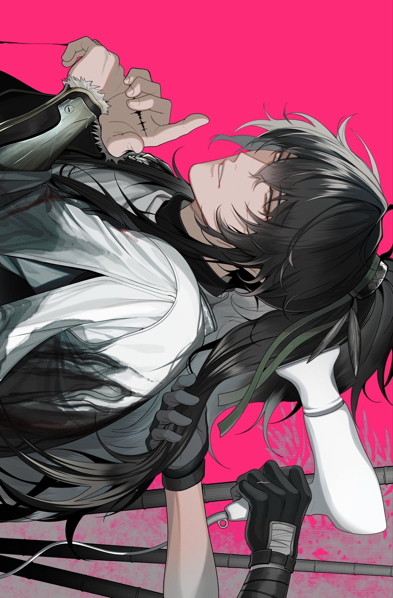 akaioringo2023, komeiji koishi, touhou, absurdres, highres, black background, black hat, blue eyes, bowler hat, floral border, green skirt, hat, hat ribbon, long sleeves, reaching, reaching towards viewer, ribbon, shirt, skirt, white hair, wide sleeves, yellow ribbon, yellow shirt