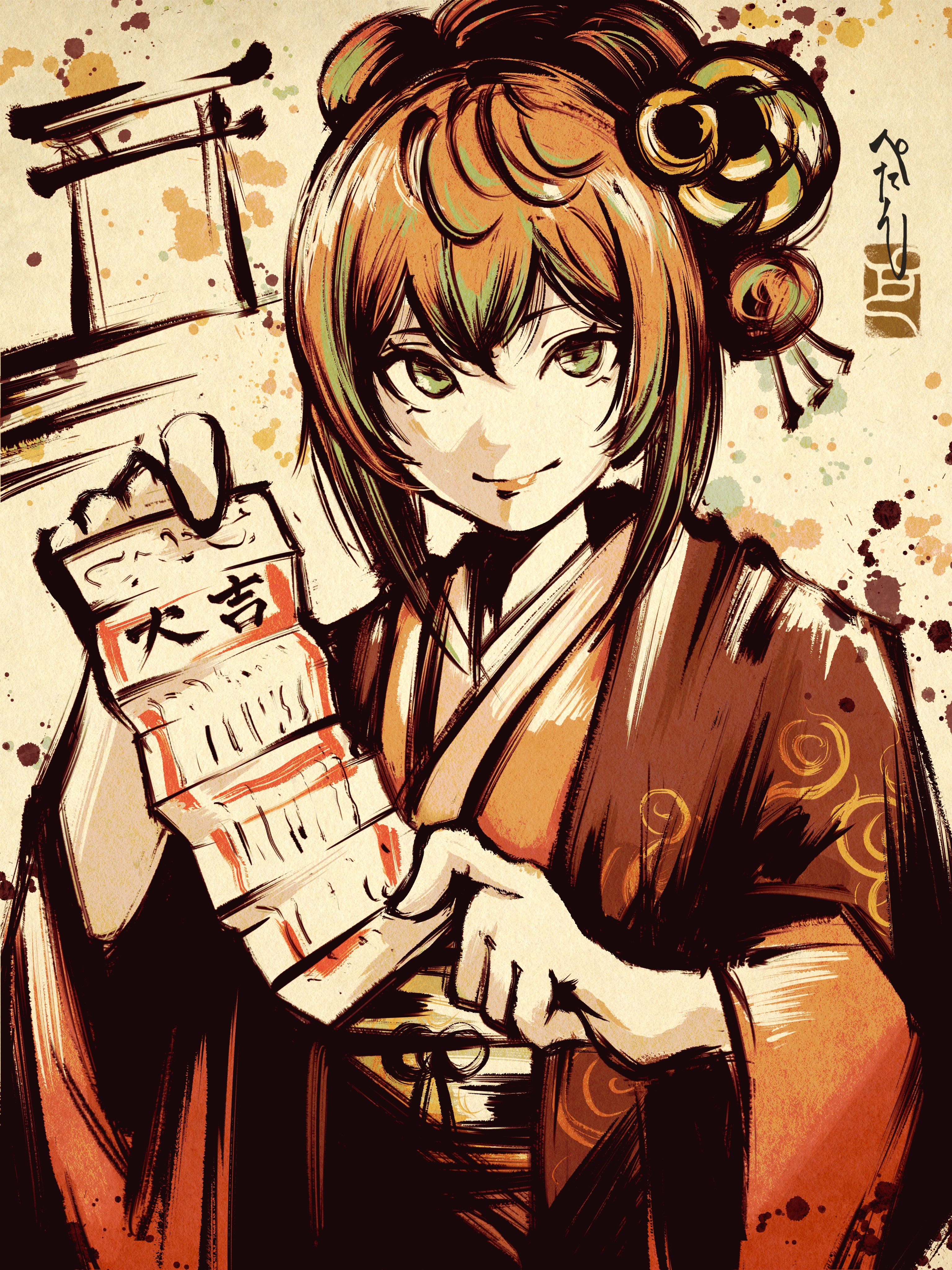 brown hairgreen hairink wash paintingjapanese clotheskimonomulticolored hairsolostreaked hairtwo-tone hairupper body